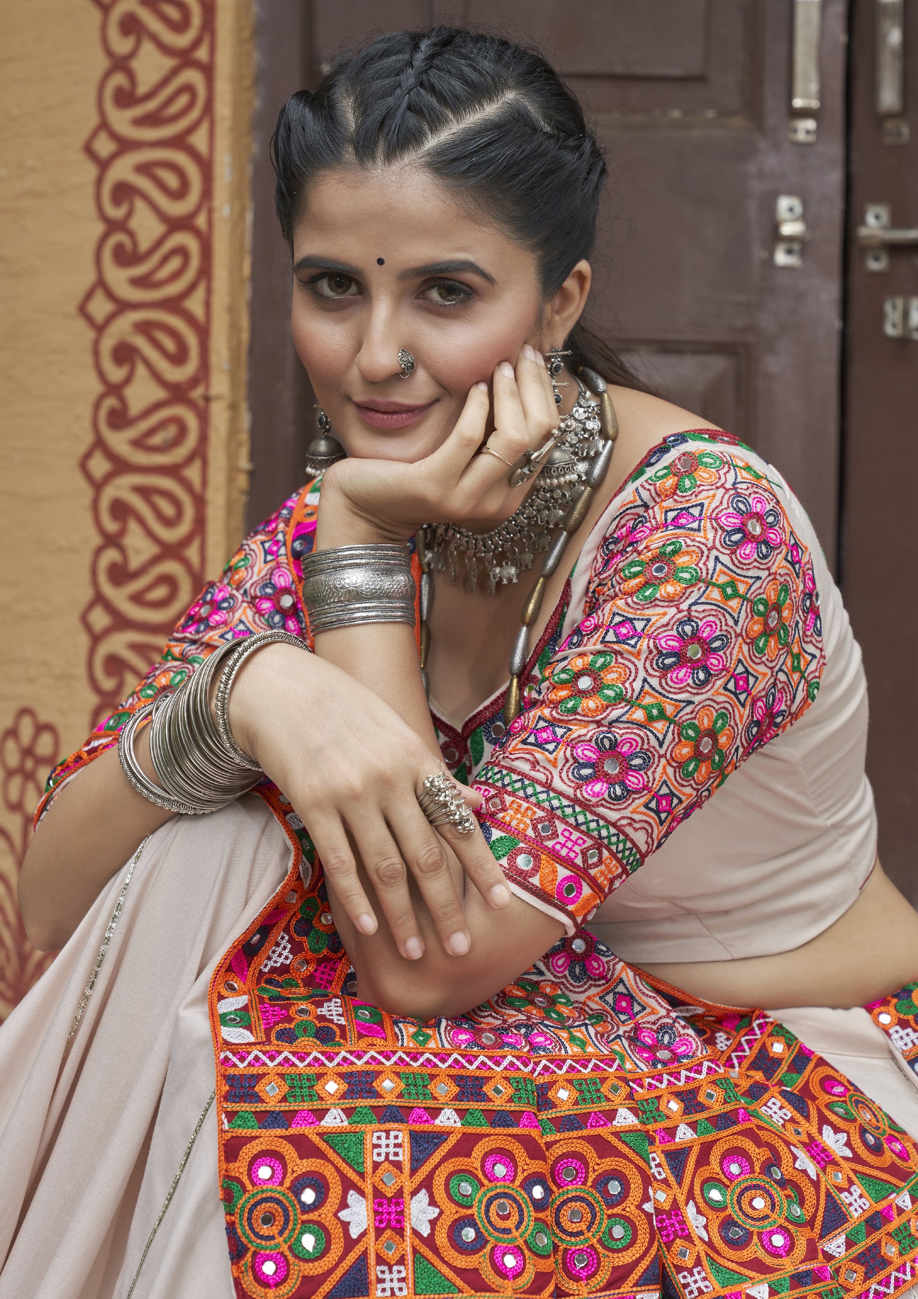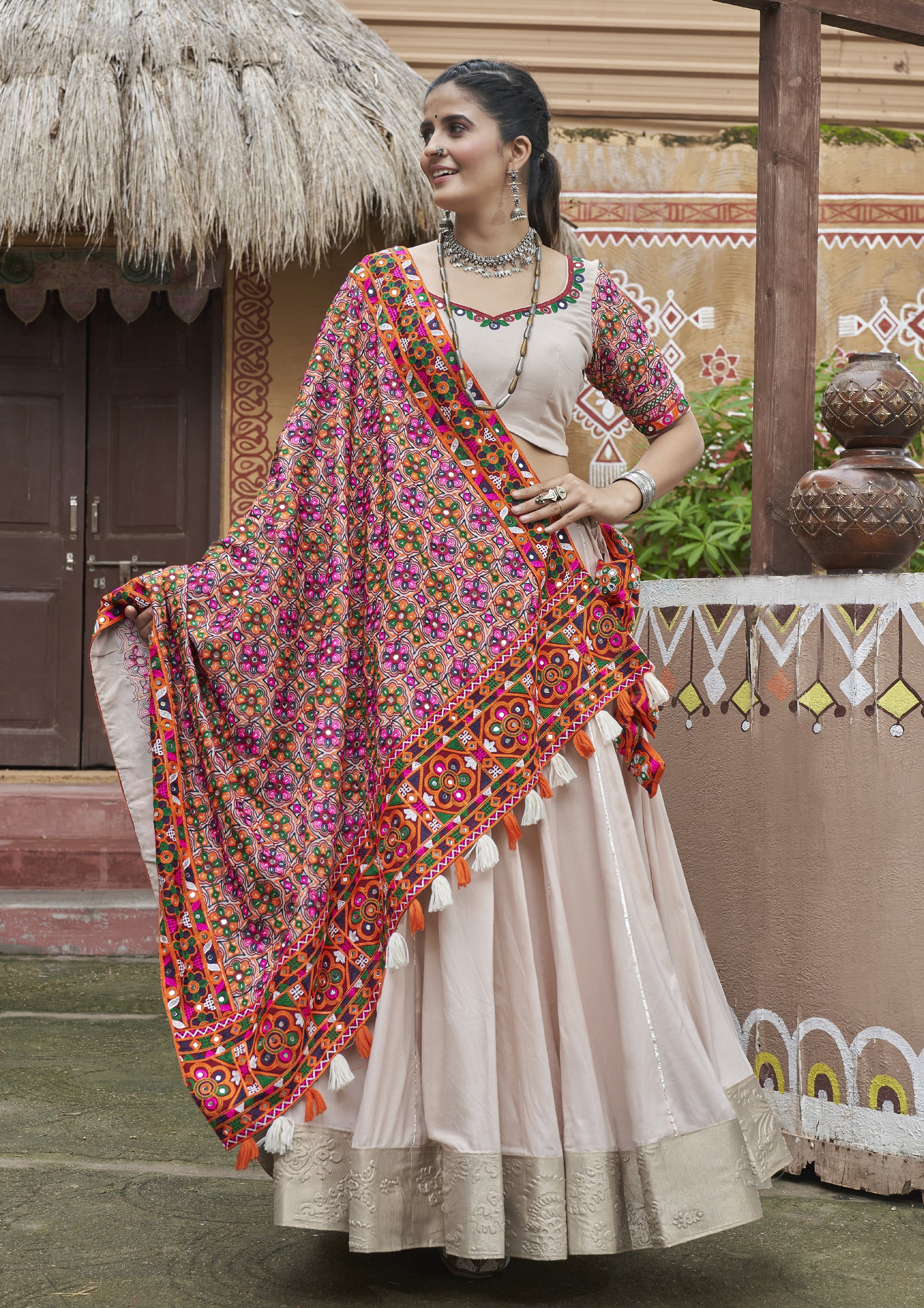 Beige Floral Textured Indo-Western with Peach Accents