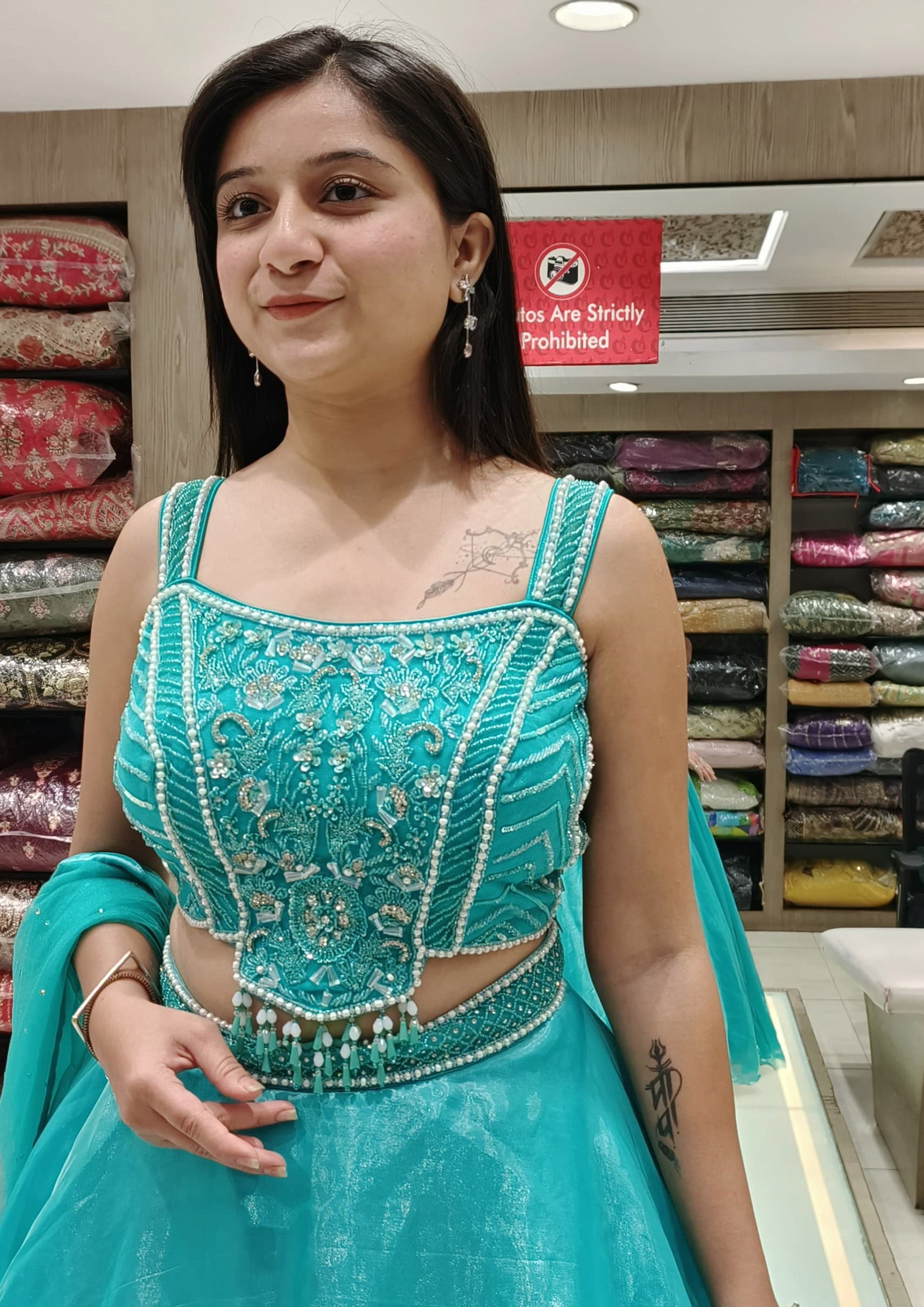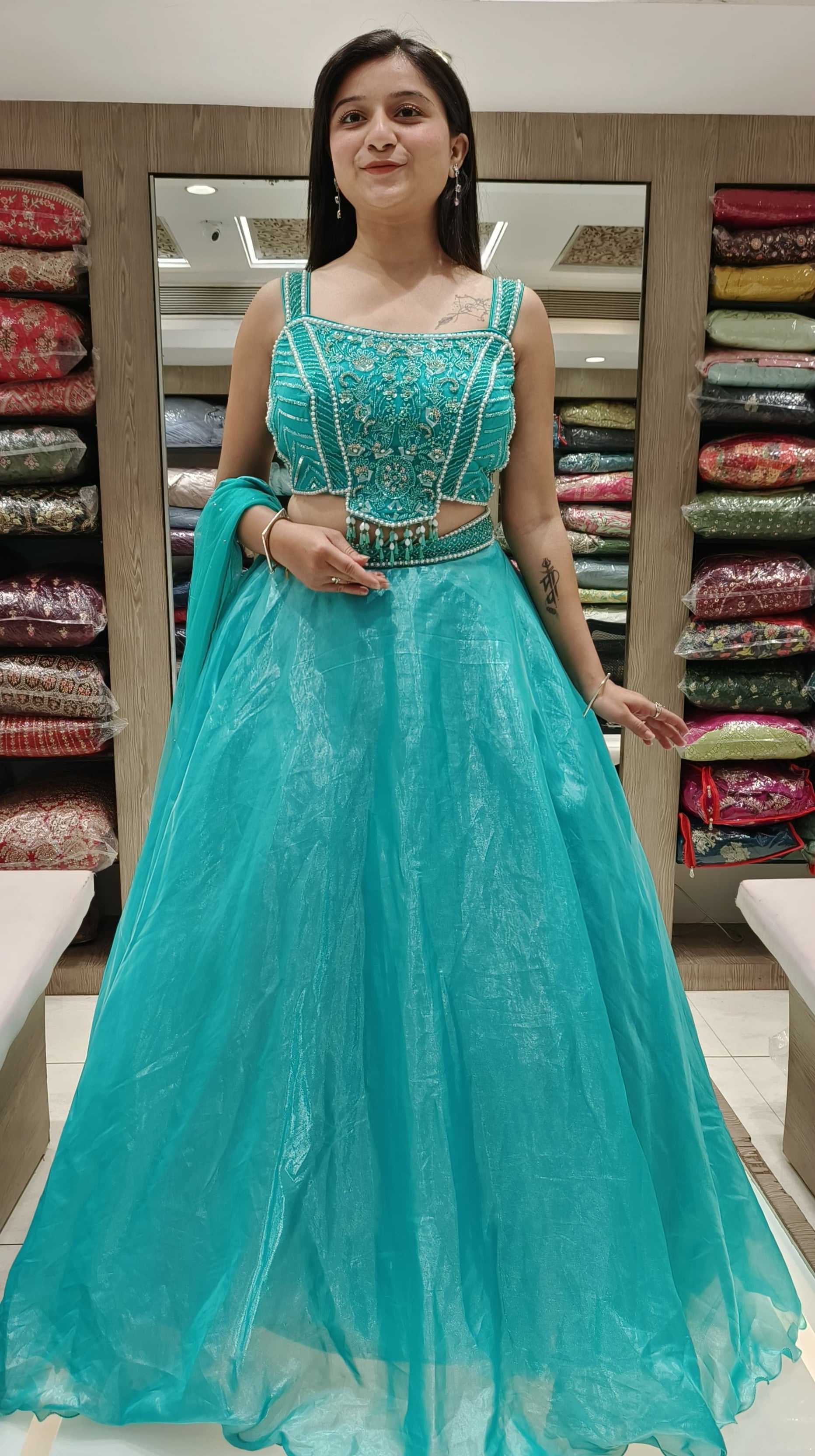 Aqua Color Organza Silk Pearls Work Lehenga Choli