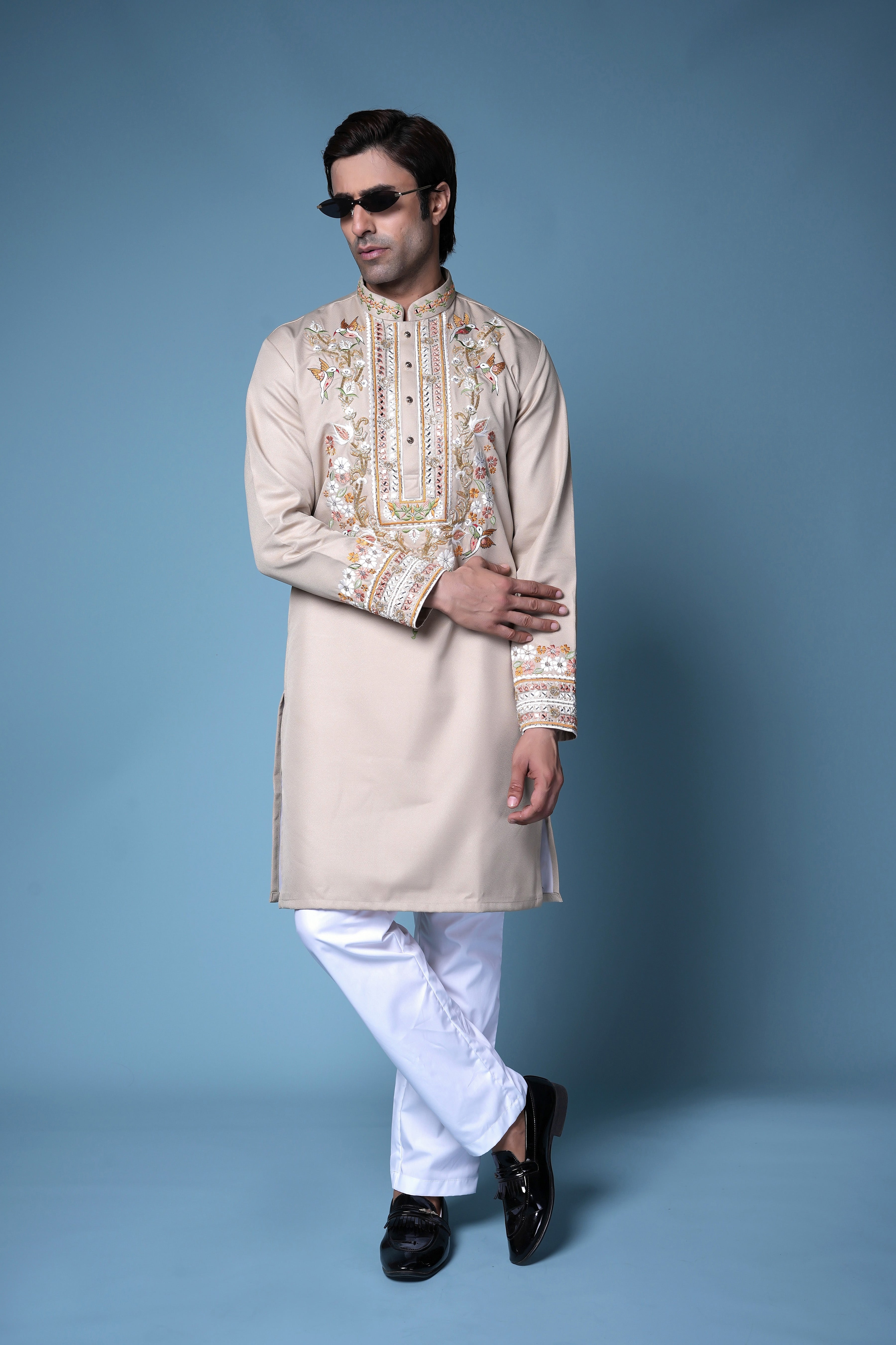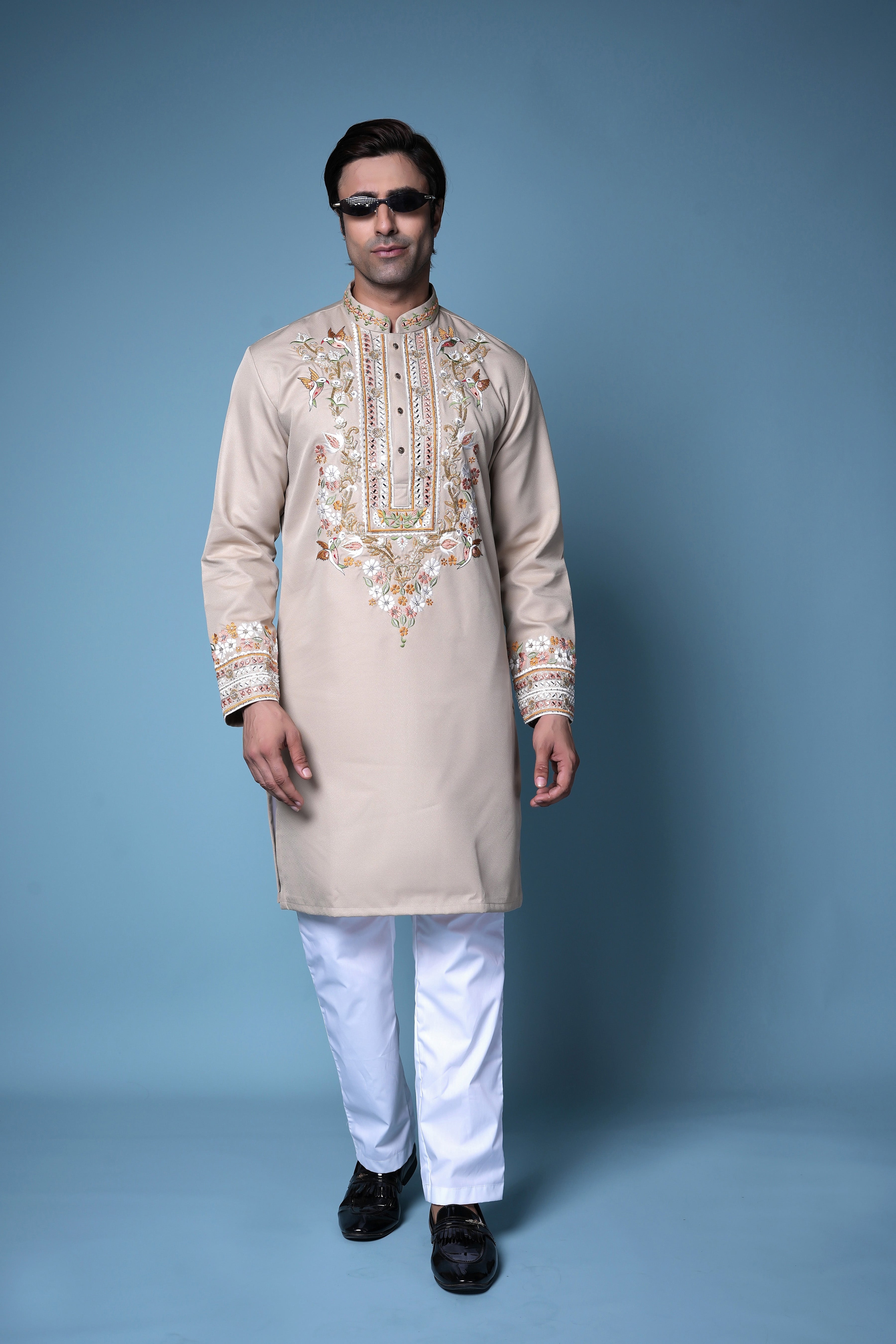 Beige Zardosi Embroidered Silk Kurta Set