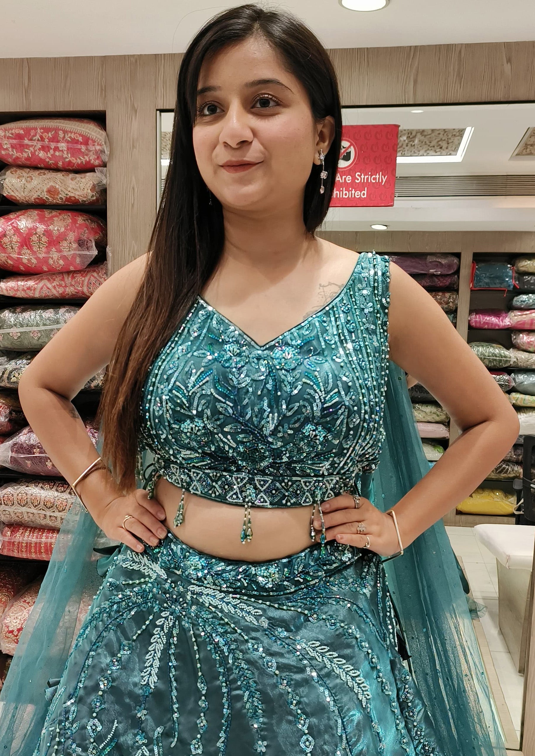 Aqua Color Organza Silk Pearls Work Lehenga Choli