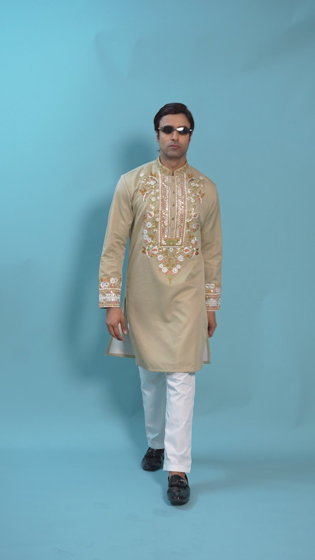 Radiate regal charm in this beige zardosi embroidered silk kurta set, a masterpiece that blends traditional craftsmanship with modern sophistication. The intricate multicolor thread and zari embroidery across the chest and sleeves add a royal elegance, making it perfect for festive occasions or wedding celebrations. Tailored in a smooth silk-textured fabric, this kurta ensures a luxurious feel and effortless style. Paired with classic white trousers, it’s the ideal outfit for groomsmen, festive gatherings, or elegant evening events.
