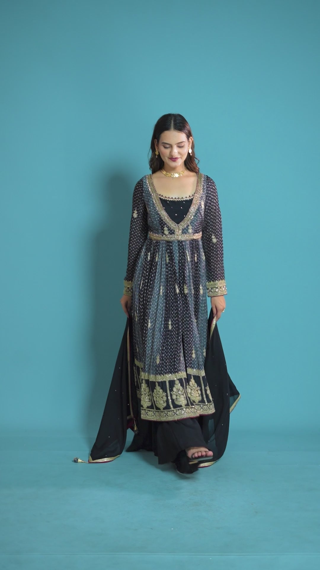 Elevate your ethnic look with this stunning black embroidered georgette sharara suit, designed with intricate golden thread and sequin work that adds a touch of regal sophistication. The flared sharara is beautifully complemented by a long embroidered kurta featuring detailed borders and a matching dupatta that enhances the ensemble’s elegance. Perfect for festive occasions, weddings, or evening parties, this outfit combines timeless charm with modern grace, making you stand out effortlessly.