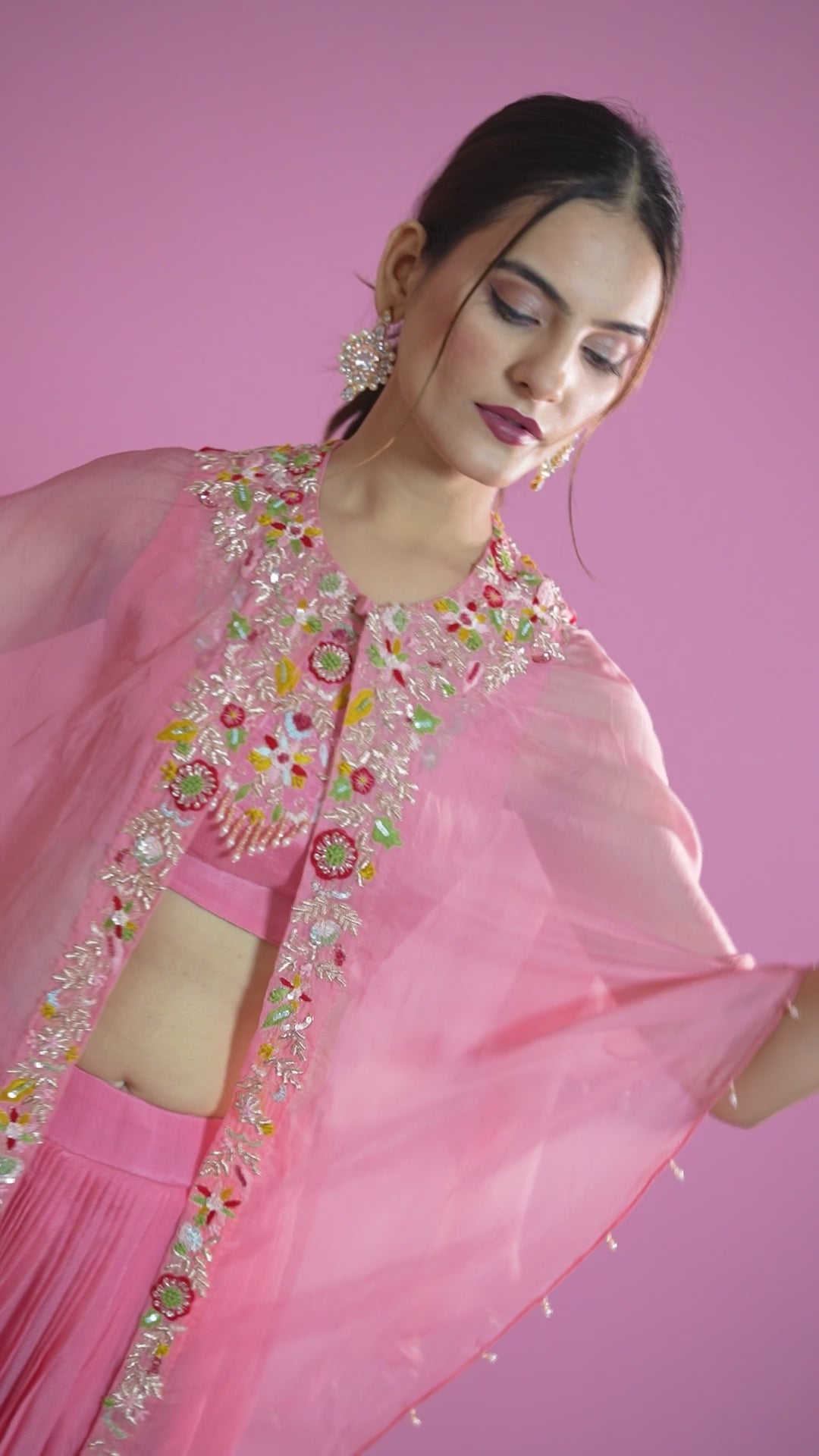 Radiate elegance and grace with our Blush Pink Embroidered Cape Lehenga Set, designed for the modern woman who loves a blend of traditional charm and contemporary flair. The soft organza cape features intricate floral embroidery adorned with delicate bead accents, gracefully draping over a matching silk lehenga and crop blouse. Perfect for festive occasions, weddings, or evening celebrations, this ensemble adds a dreamy, feminine touch to your look. Pair it with statement earrings and heels to complete your enchanting style.