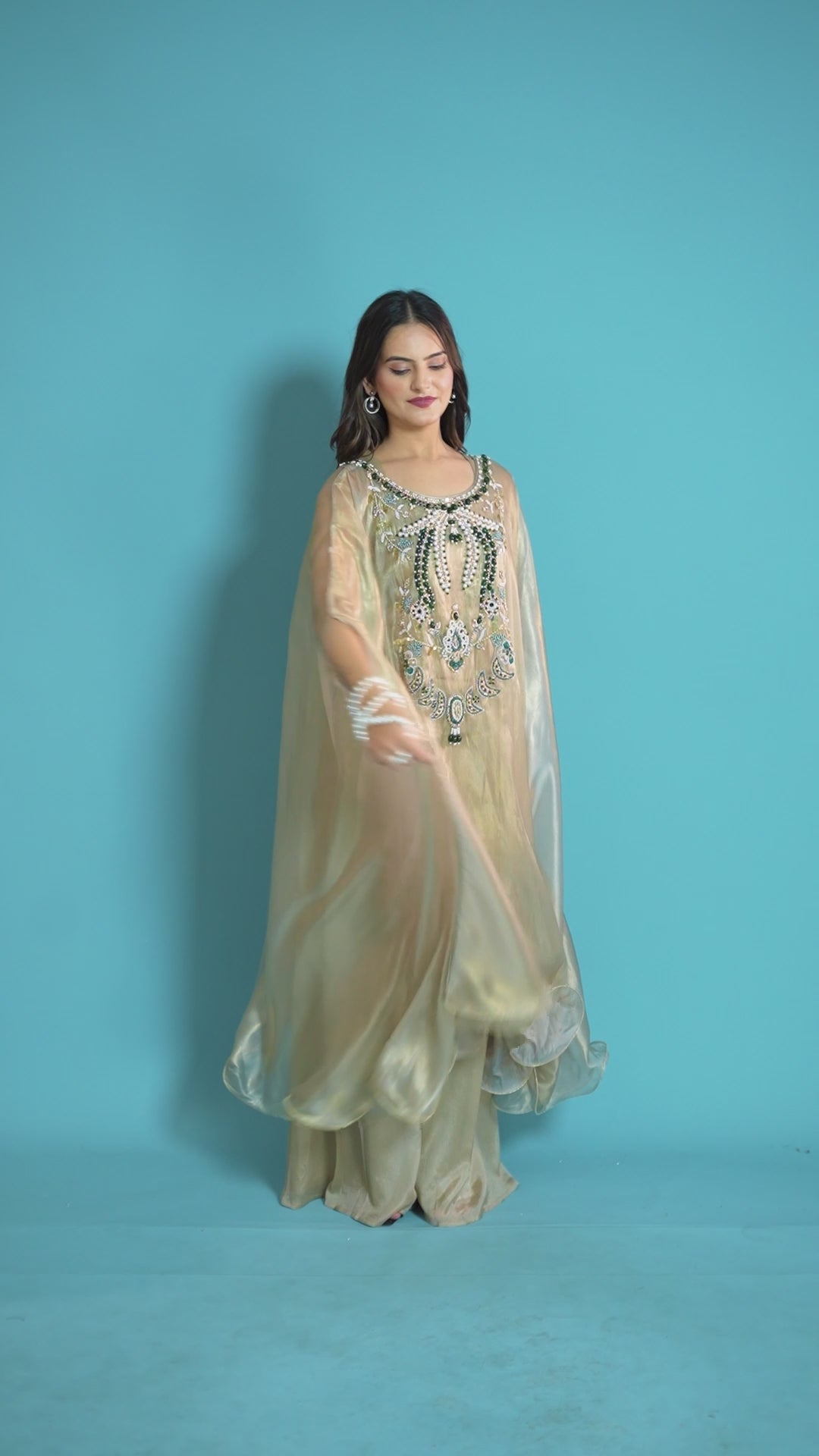 Elevate your ethnic charm with this stunning pearl beige kaftan gown featuring an effortlessly flowing silhouette and exquisite hand embroidery. The intricately embellished neckline, adorned with pearls and green beadwork, adds a regal touch to the lustrous fabric that drapes gracefully with every move. Perfect for festive celebrations, evening gatherings, or destination weddings, this kaftan gown blends traditional elegance with modern sophistication for a truly captivating look.