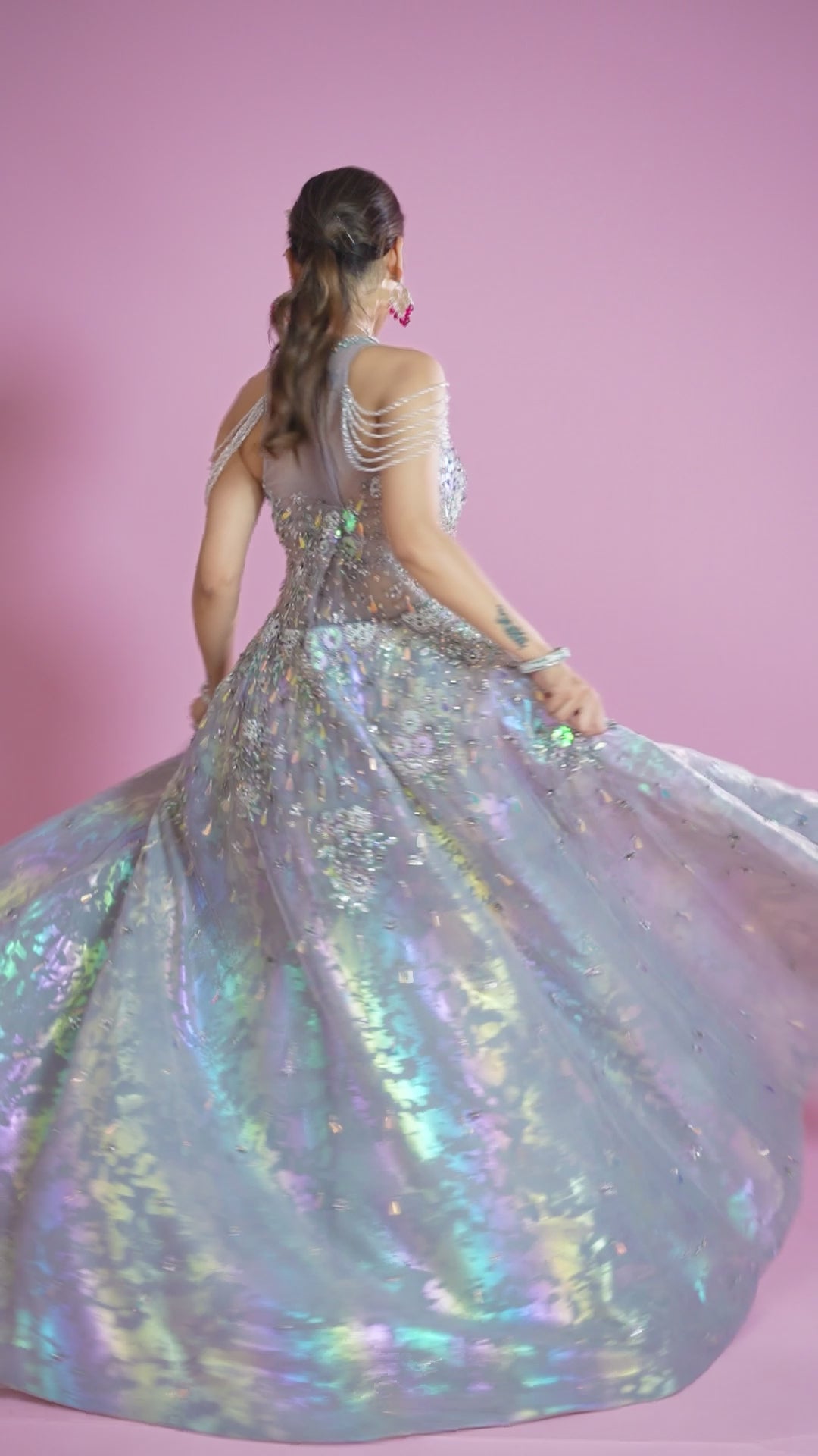 Dazzle like a dream in this enchanting iridescent silver ball gown, designed to make every moment unforgettable. The shimmering holographic fabric reflects pastel hues with every movement, while the crystal and sequin embellishments add a touch of regal sparkle. Featuring a plunging illusion neckline, cold-shoulder beaded detailing, and a voluminous flared silhouette, this gown perfectly blends elegance with modern glamour—ideal for receptions, red-carpet events, or grand celebrations.
