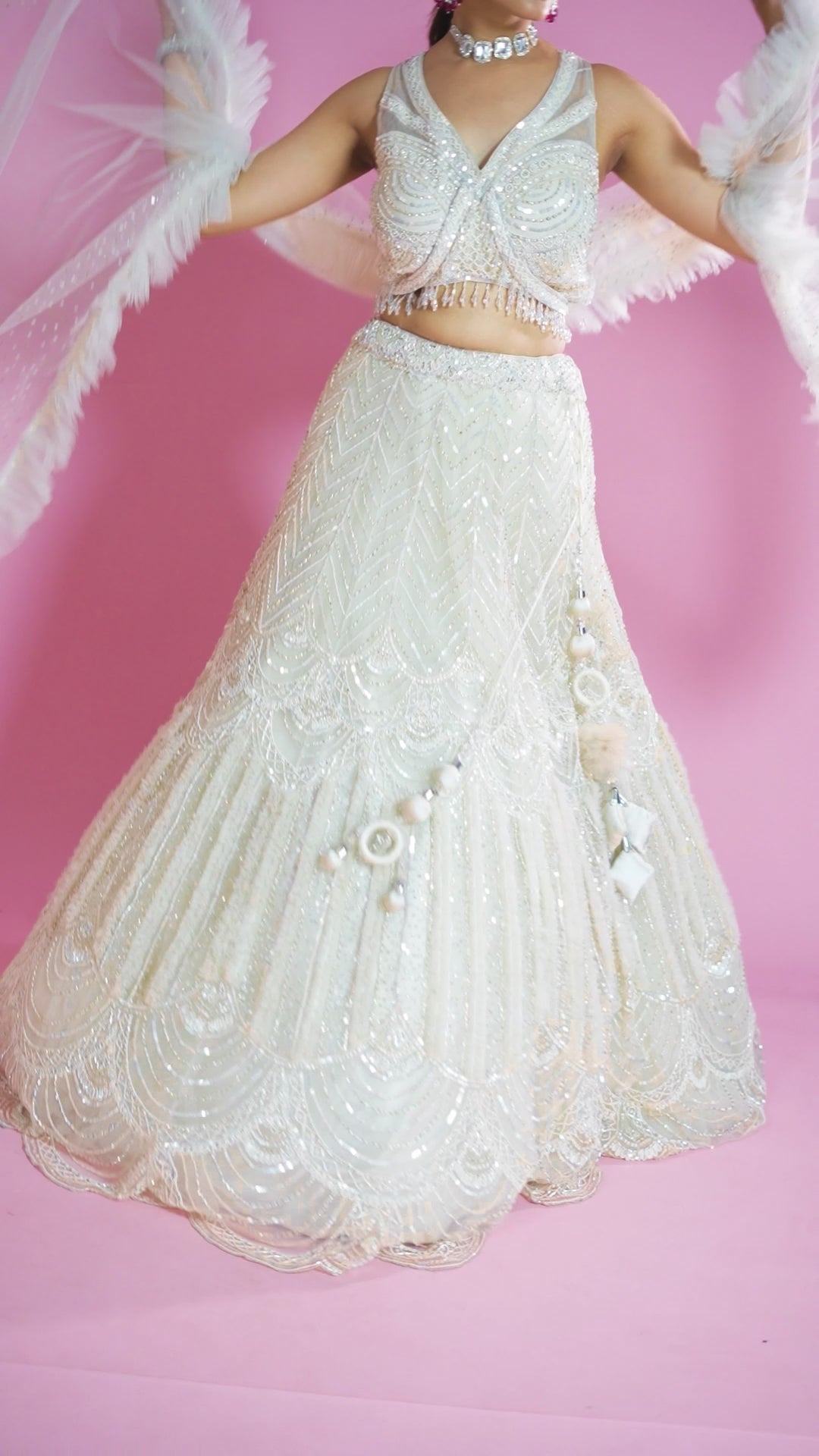Step into elegance with this Ivory Crystal Embellished Lehenga Set, a masterpiece of modern glamour and traditional craftsmanship. The ensemble features a beautifully hand-embroidered lehenga adorned with intricate sequins, beads, and pearl work that shimmer with every move. The stylish blouse is designed with delicate detailing, fringe embellishments, and a flattering neckline, adding a contemporary charm. Complementing the outfit is a soft net ruffle dupatta, edged with shimmer for a dreamy finish. Perfect for wedding receptions, engagement parties, and festive celebrations, this lehenga brings together grace, luxury, and timeless style.