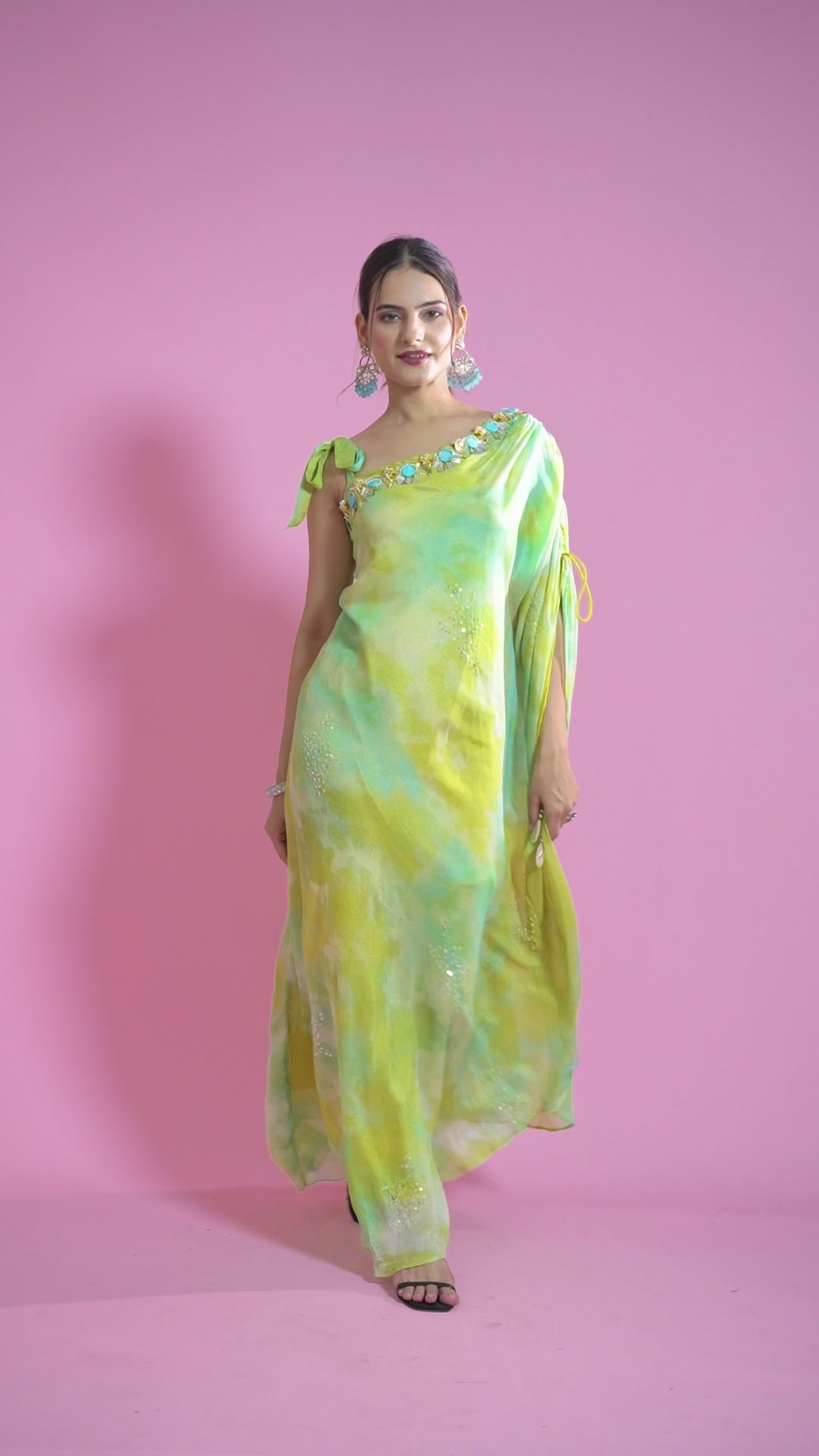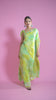 Effortlessly chic and refreshingly modern — this one-shoulder draped gown in soothing lemon and mint tones is a statement piece for every celebration. Embellished with stone-studded neckline detailing and subtle shimmer accents, it blends sophistication with contemporary flair. Ideal for cocktail nights, destination weddings, and evening soirées.