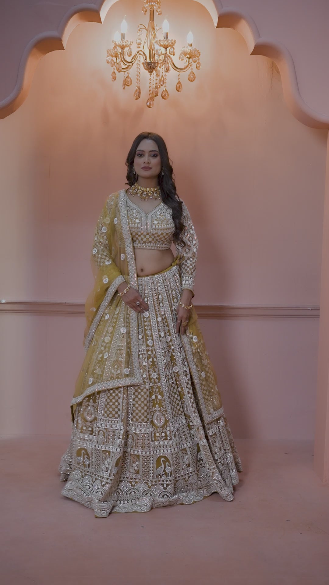 · A mustard yellow lehenga choli with intricate hand embellishments, sequin accents, and a lightweight net dupatta with delicate borders.