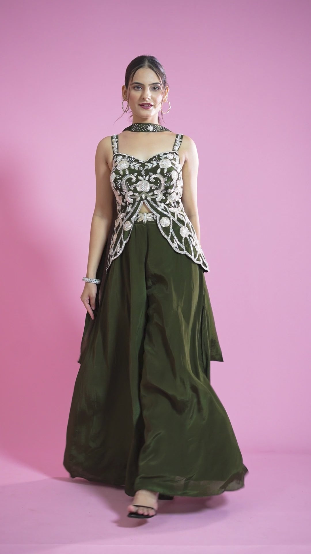 Step into timeless elegance with this stunning Olive Embellished Peplum Sharara Set. The intricately hand-embroidered peplum top, adorned with shimmering sequins and beadwork, adds a regal touch to your festive look. Designed with a contemporary front-slit silhouette and paired with flowy sharara pants, this ensemble effortlessly blends modern glamour with traditional grace. The delicate strappy back detail enhances its charm, while the soft satin fabric ensures luxurious comfort. Perfect for wedding festivities, receptions, and evening celebrations, this outfit promises to make you the center of attention wherever you go.