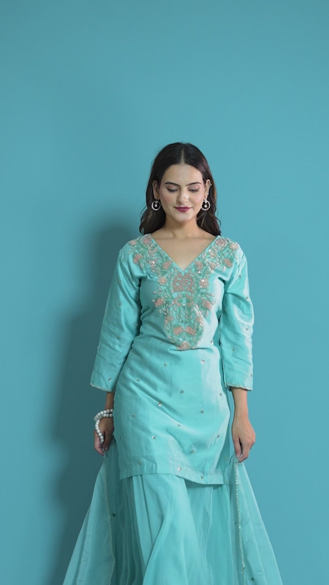 Step into serene elegance with this pastel blue embroidered kurta set, a perfect blend of grace and comfort. Crafted from fine silk fabric, the kurta features delicate floral thread and sequin embroidery on the neckline and sleeves. It is paired with a flowing georgette sharara and a soft organza dupatta finished with subtle detailing for a refined finish. Ideal for daytime festivities, mehendi functions, or family celebrations, this ensemble radiates effortless sophistication.