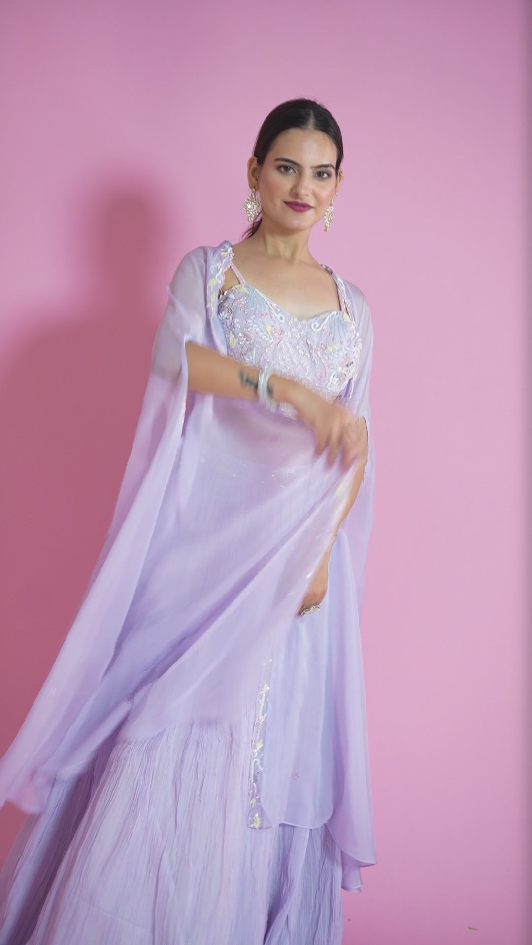 Step into elegance with this pastel lilac lehenga set featuring a beautifully embellished blouse adorned with delicate embroidery and sequins. The soft, flowy skirt paired with a sheer dupatta adds a dreamy charm to the ensemble, making it a perfect pick for receptions, festive occasions, or cocktail nights. This ethereal outfit effortlessly blends sophistication with modern grace.