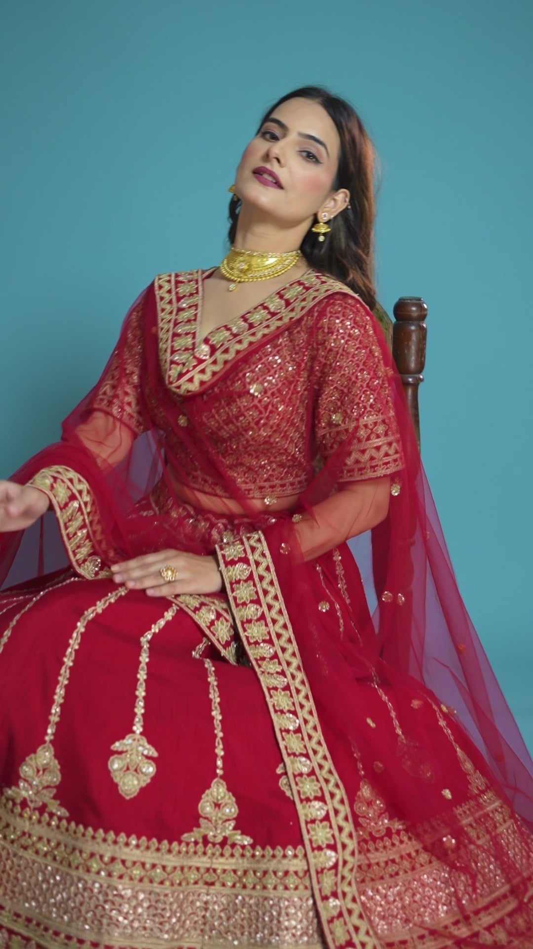 Make a grand statement with this elegant red bridal lehenga choli adorned with intricate zari and sequin embroidery that exudes royal charm. The heavily embellished blouse and flared lehenga are beautifully paired with a matching net dupatta featuring ornate golden borders and tassel detailing. Perfect for weddings, festive occasions, or bridal events, this lehenga set combines traditional craftsmanship with timeless beauty, offering a stunning and graceful look for your special day.