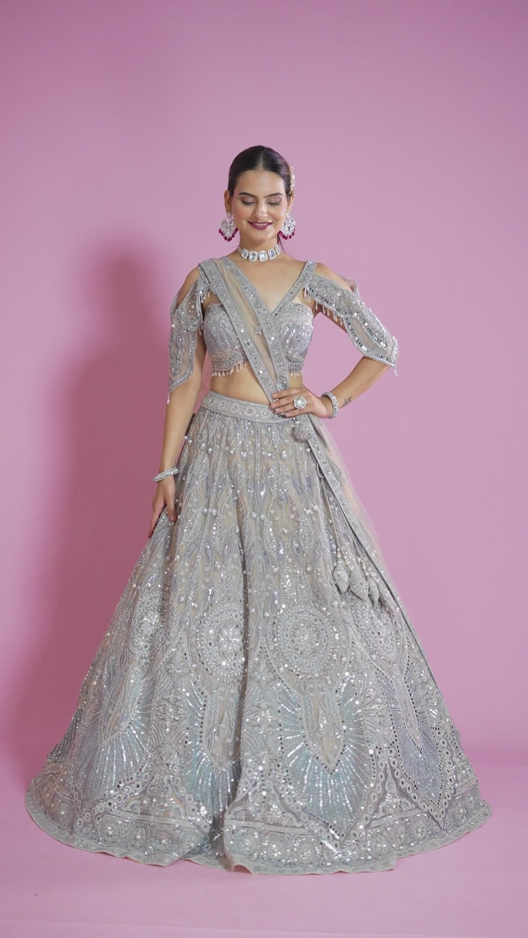 Shine like a celestial diva in our Silver Celeste Lehenga Set, a stunning blend of contemporary design and traditional artistry. Crafted on a shimmering net base, this masterpiece is adorned with mirror work, sequins, and intricate thread embroidery, exuding a radiant charm that captures every gaze. The cold-shoulder blouse adds a modern twist with its bold yet graceful silhouette, while the coordinated dupattaenhances the ensemble’s ethereal appeal. Perfect for receptions, cocktail nights, or glamorous festive soirées, this outfit defines luxury with an edge.