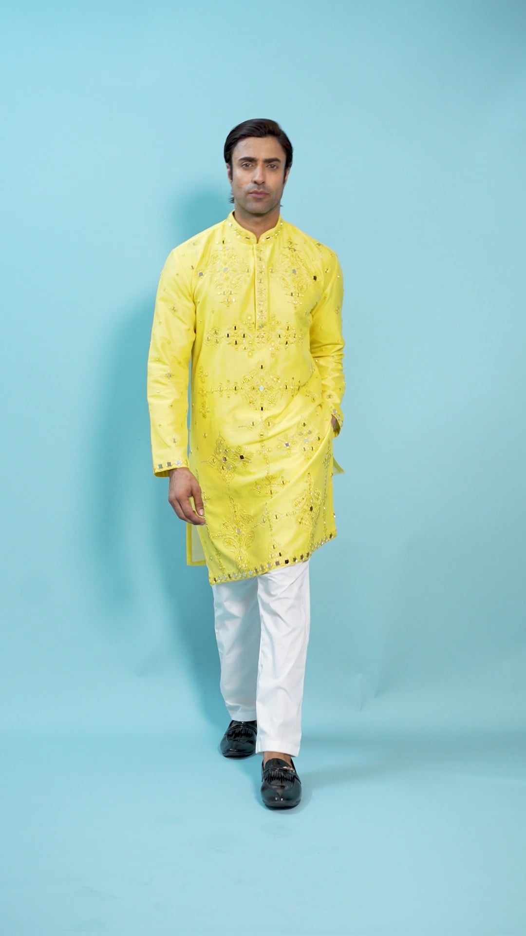 Radiate festive charm in this Sunshine Yellow Mirror Work Silk Kurta Set, designed to capture attention at every celebration. The vibrant yellow hue symbolizes joy and positivity, while the intricate mirror and thread embroidery adds a dazzling traditional touch. Crafted from premium silk fabric, this kurta offers both comfort and elegance, making it ideal for haldi ceremonies, festive gatherings, and daytime weddings. The detailed work around the neckline, cuffs, and hemline brings an exquisite handcrafted appeal that reflects Indian artistry at its finest.