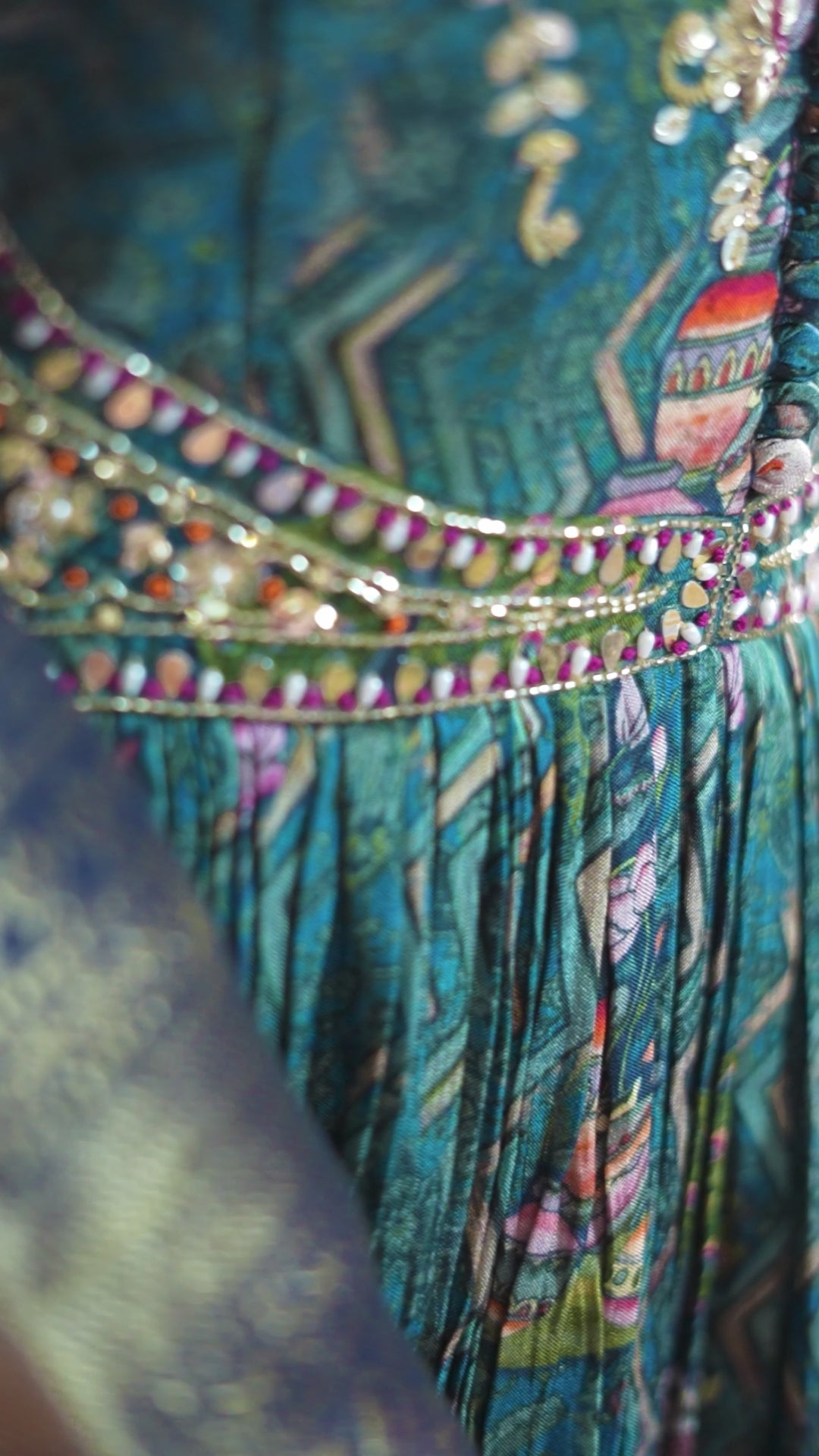 Embrace royal elegance with this stunning teal Anarkali gown, adorned with intricate ethnic prints and a rich zari border. The full-sleeved silhouette and detailed mirror work on the bodice add a regal charm, making it perfect for festive occasions, weddings, or cultural celebrations. Crafted from luxurious fabric, this gown effortlessly blends tradition with modern sophistication.