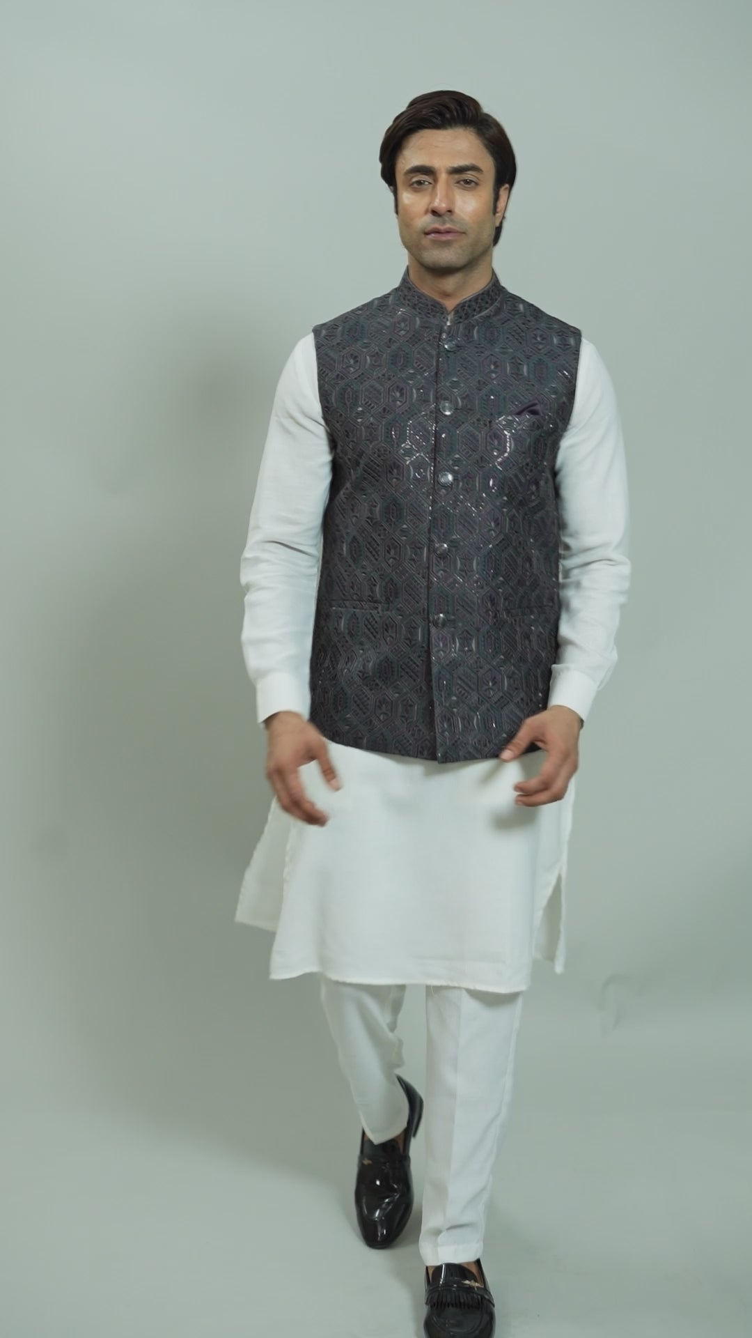 Redefine traditional sophistication with this deep plum and black jacquard waist coat set. The intricately woven geometric pattern adds a luxurious sheen, making it a standout piece for refined celebrations. Paired with a pristine white kurta set, this ensemble balances classic charm with a touch of modern opulence. Perfect for festive events, cocktail evenings, or wedding functions.